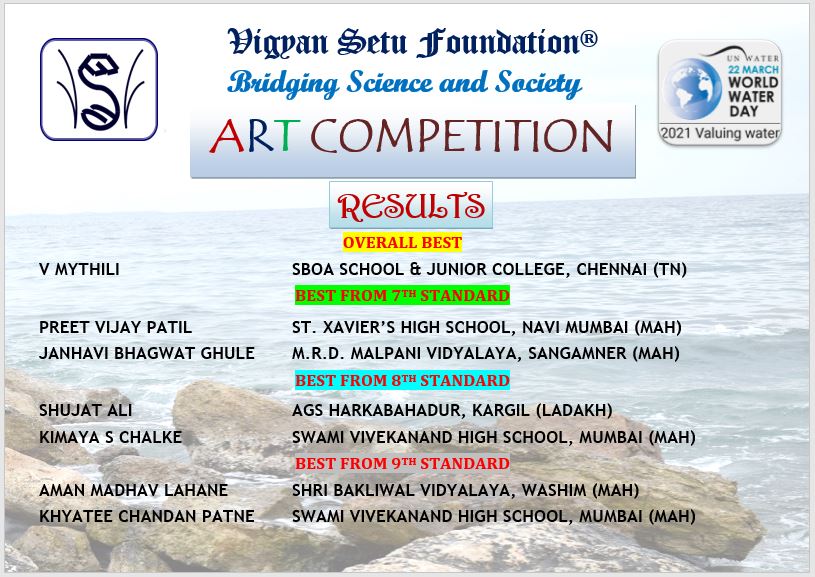 Vigyan Setu Foundation would like to express a deep sense of gratitude to all the Child Artists for their wholehearted participation in the ART COMPETITION organized to celebrate World Water Day. These artistic expressions have been adjudged by the jury as the WINNING artworks.