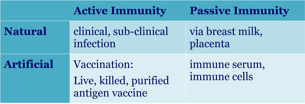 - Artificial active immunity (wherein antigens are deliberately introduced through a vaccine)