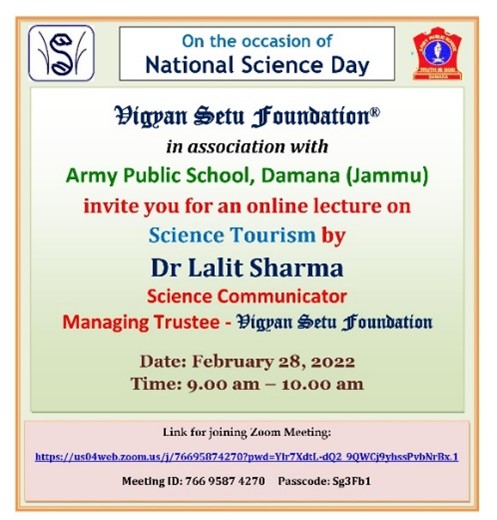In the morning an online talk was delivered on Science Tourism to the students and staff of Army Public School, Damana (Jammu), Though the program was virtual but the lively interaction with the enthusiastic students added more than reality.