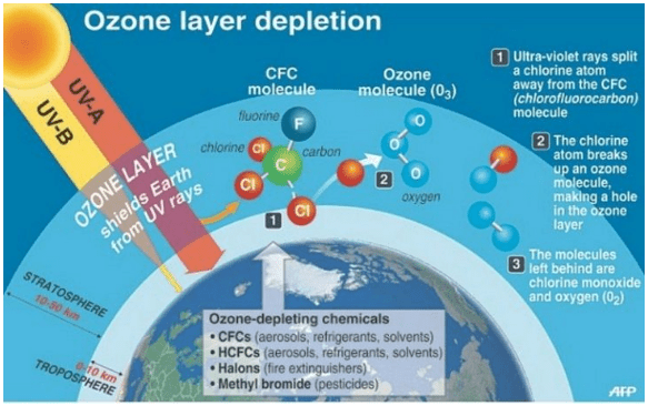 The main reason for the depletion of the Ozone layer is human activity mainly carbon emission and chemicals that contain chlorine or bromine. These chemicals are generally referred to as ODS that is Ozone – Depleting Substances. Since the early 1970’s scientists from all over the world observed a reduction in stratospheric ozone and it was found more prominent in Polar Regions. Do you know that one molecule of chlorine has the potential to break down thousands of ozone molecules? The main ozone-depleting substances include carbon tetrachloride, chlorofluorocarbons (CFCs), hydrochlorofluorocarbons (HCFCs), and methyl chloroform. Halons, which are known as brominated fluorocarbons, contribute highly to ozone depletion. The pollutants, which affects the Ozone layer have a lifetime of about 100 years.
