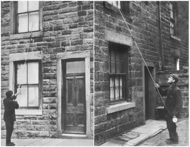 One job in early English mill and factory towns was to knock on peopleโs windows to wake them up for work.