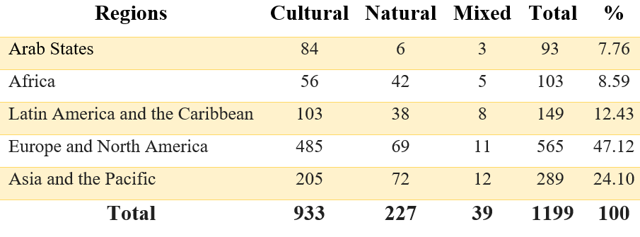 There are currently 1,199 world heritage sites. They are divided between 933 cultural, 227 natural, and 39 mixed sites.